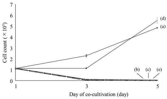 HepG2 cells were cultured with bovine serum albumin (BSA) and four fatty acids, i.e., palmitic, stearic, oleic, and linoleic acids; the growth curves of these cells are shown in Figure 1. Albumin is a carrier of fatty acid chains, which makes the fatty acid soluble in the culture medium. Initially, 105 cells were seeded in each dish. The number of live cells cultured with palmitic, stearic, and linoleic acids decreased down to 2000–3000 in their culturing dishes after 5 days. Ricchi et al. [] suggested that saturated fatty acids induce apoptosis in hepatocytes. Curve (e) for the cells cultured with linoleic acid shows a reduction in the number of cells similar to that of the cells cultured with saturated fatty acids, although linoleic acid is an unsaturated fatty acid. Zhang et al. [] reported that linoleic acid induces apoptosis in hepatoma cells, which seems to be the case in this study. In contrast, curve (d) for the cells cultured with oleic acid shows slow cell growth until day 3 under co-cultivation with fatty acid, followed by greater cell growth than that of control cells after 5 days. This suggests that oleic acid has a specific pathway for fat metabolism in HepG2 cells.