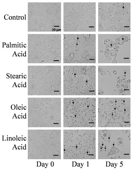 Optical microscopy images of HepG2 cells cultured without fatty acid (control) and with palmitic, stearic, oleic, and linoleic acids were observed on days 0, 1, and 5 of co-cultivation. Lipid droplets are indicated by arrows.