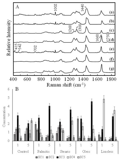 The spectra were analyzed via MCR-ALS analysis to investigate the molecular compositional changes in more detail. Figure 5A compares the spectral components (SCs) from 1 to 5 obtained by MCR analysis and the pure spectra of oleic and linoleic acids. SCs 1(a), 2(b), and 5(e) show bands at 1003 and 1030 cm−1 due to proteins, which indicates that these SCs include a large contribution from the protein species. SCs 2 and 5 exhibit a weak band at 1735 cm−1 due to the C=O stretching mode, suggesting that they also include contributions from lipids. Quantitative analysis based on SC1, 2, and 5 is not suitable because these components have mixed contributions from proteins and other cellular components. In contrast, the SCs 3(c) and 4(d) closely resemble the spectra of pure oleic (f) and linoleic (g) acids, respectively. The spectra of pure fatty acids lack a band near 1735 cm−1 and show a slightly stronger band near 1660 cm−1. Because they usually adopt a dimer structure in which the oxygen of the -C=O group is bound to the hydrogen of HO- by a hydrogen bond, the band due to the C=O stretching mode shifts far down and overlaps with a band due to the C=C stretching mode near 1660 cm−1 []. This strongly suggests that SCs 3 and 4 represent the oleic and linoleic fatty chains in the triacylglycerol species. The SC scores are shown in Figure 4B. In the control cells, the score plots of 1 and 5 days show variations, but the ratio between the scores of SC 3 and 4 (SC4/SC3) is maintained at approximately 0.5. This suggests that the rate of fat accumulation for oleic chains is approximately twice as high as that for linoleic chains. The ratio SC4/SC3 varies slightly in the cells cultured with palmitic, stearic, and oleic acids, which suggests that the cells synthesize oleic based on these fatty acids. Linoleic acid is an essential lipid that HepG2 cell is not synthesize by itself. The component of linoleic acid found in the control cell and cells treated with palmitic, stearic and oleic acids came from the culturing medium, probably from fetal bovine serum (FBS).