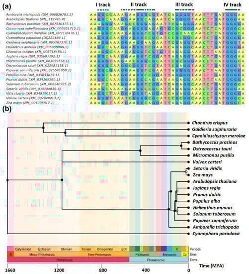- Ferrari, C.; Proost, S.; Janowski, M.; Becker, J.; Nikoloski, Z.; Bhattacharya, D.; Price, D.; Tohge, T.; Bar-Even, A.; Fernie, A.; et al. Kingdom-Wide Comparison Reveals the Evolution of Diurnal Gene Expression in Archaeplastida. Nat. Commun. 2019, 10, 737. [Google Scholar] [CrossRef]