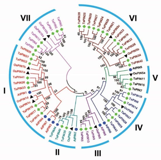 PINs are plant-specific transmembrane proteins involved in polar auxin transport [,,,]. PIN family proteins regulate multiple developmental processes, including morphogenesis, embryogenesis, organogenesis, and environmental stimuli [,,,,,,]. PIN gene family members have been reported in several plant species [,,,,,,]; however, to the best of our knowledge, this is the first time we identified the PIN genes in the wheat genome. Several studies demonstrated that PIN genes also existed in primitive land plants and expanded over the time of evolution [,]—a total of 44 TaPIN genes identified in the wheat genome (Table 1). The phylogenetic analysis revealed that the TaPIN gene family could be classified into seven groups or subfamilies. The phylogenetic analysis showed that the long or canonical PINs were clustered into groups I and II, while short or noncanonical PINs clustered into groups III, V, and VI, and groups IV, VI, and VII consisted of monocot-specific TaPINs (Figure 1). These genes possibly have the monocot-specific functions that might impact physiological and morphological establishment, such as phyllotaxy or development of the unique root system [], although TaPIN genes were well allocated into the known group of Arabidopsis and rice PINs, suggesting that TaPINs might originate from a common ancestor. Further, the majority of the TaPINs exhibited orthologous relationships with Arabidopsis and rice PINs. The phylogenetic tree also showed that all groups have an expanded number of members (Figure 1), indicating that duplications of these TaPINS occurred during evolution.