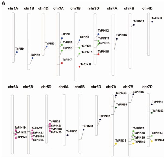 The wheat PIN gene family is extensively expanded and had relatively more PINs compared to the previously reported PINs in A. thaliana, O. sativa, Z. mays, G. max and N. tabacum [,,,,]. The gene duplication processes, including segmental, tandem, and whole-genome duplications, are the main driving forces for expanding the gene family in different plant species [,]. Chromosomal mapping of TaPIN genes revealed that the 44 TaPINs were not uniformly distributed on 21 chromosomes (Figure 2A,C). The gene number on each chromosome varied from one to five, with chromosomes 1A, 1B, 1D, 4A, 4B, 4D, 6A, 6B and 6D having a single gene, while chromosome 7A had three genes, chromosomes 3A, 3B, 3D, 5A, 5B, 5D and 7D contained four genes, and chromosome 7B had five genes. Gene duplication analysis showed 15 pairs of duplicated genes which shared high nucleotide sequence similarity. The duplicated pairs are TaPIN25:TaPIN28, TaPIN24:TaPIN27, TaPIN21:TaPIN29, TaPIN22:TaPIN26, TaPIN34:TaPIN42, TaPIN7:TaPIN15, TaPIN9:TaPIN13, TaPIN6:TaPIN10, TaPIN37:TaPIN38, TaPIN39:TaPIN43, TaPIN1:TaPIN2, TaPIN8:TaPIN12, TaPIN17:TaPIN18, TaPIN30:TaPIN32 and TaPIN36:TaPIN41. Further, the Ka/Ks ratios of 15 gene pairs were less than 1, revealing that TaPIN genes underwent a strong purifying selection pressure (Figure S4 and Table S2). The expansion of the TaPIN gene family might be due to the natural whole-genome duplication events. OsPIN1a-1d and three OsPIN5 are the results of segmental duplications in rice []. Gene duplication events were also reported in the three maize PINs, such as ZmPIN1a-1c []. Our gene duplication analysis revealed that the TaPIN gene duplication events were similar, as previously described in rice and maize. Therefore, these results demonstrate that whole-genome duplication and segmental duplications might play an important role in expanding and evolving the TaPIN genes.