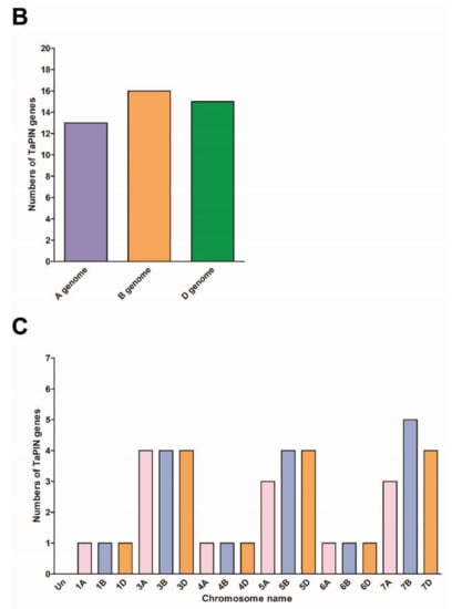 The genomic chromosomal distribution of the identified TaPIN genes in wheat was mapped to the corresponding chromosomes according to the chromosomal locations of PIN genes by the PhenGram online server. The TaPIN genes are present on the 18 wheat chromosomes (Figure 2A and Table 1). TaPIN genes displayed a slightly higher presence on the B and D subgenomes (Figure 2B). The maximum number of TaPIN genes, for instance, 16, was mapped on the chromosomes of the B subgenome. A subgenome had the lowest number of TaPIN genes, i.e., 13. The maximum number of TaPINs is located on chromosome 7B with five genes (Figure 2C). The minimum number of TaPINs is located on chromosome 1A, 1B, 1D, 4A, 4B, 4D, 6A, 6B and 6D, having only a single gene. Conversely, none of the TaPIN genes were found on chromosome 2. Overall, all the PIN family genes were evenly distributed on the three subgenomes of wheat.