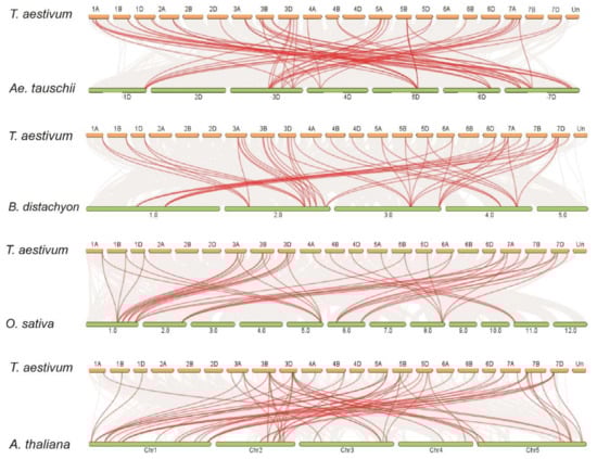 Syntenic relationships of TaPIN genes between Aegilops tauschii, Brachypodium distachyon, Oryza sativa and Arabidopsis thaliana. The gray lines in the background represent the collinear blocks within Triticum aestivum and other plant genomes, while the red lines highlight the syntenic PIN gene pairs.