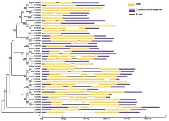 Exon–intron organization of the TaPIN genes. Yellow boxes represent exons, untranslated regions (UTRs) are indicated by blue boxes, and black lines represent introns. The lengths of the boxes and lines are scaled based on gene length. The exon and intron sizes can be estimated using the scale at the bottom.