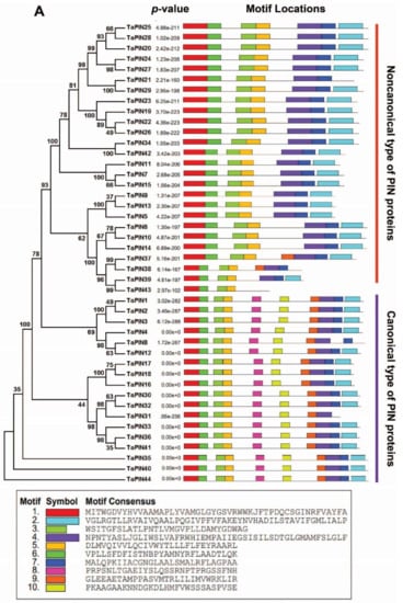 Interestingly, none of the TaPIN family members were found with AtPIN6. Similar results were reported in rice and maize [,]. Thus, these results demonstrate that the short or noncanonical PINs evolved independently from the long or canonical PINs []. The overall evolution pattern showed lineage-specific expansion of the TaPIN gene family through the partial modification of the genome that might reinforce the adaption to internal and external stimuli [,].