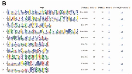 Conserved motifs of TaPIN genes elucidated by MEME. (A) Colored boxes representing different conserved motifs having different sequences and sizes. (B) Sequence logo conserved motif of the wheat PIN proteins. The overall height of each stack represents the degree of conservation at this position, while the height of the individual letters within each stack indicates the relative frequency of the corresponding amino acids.