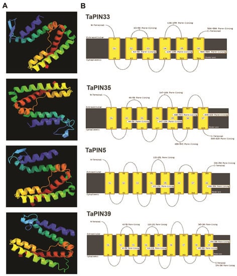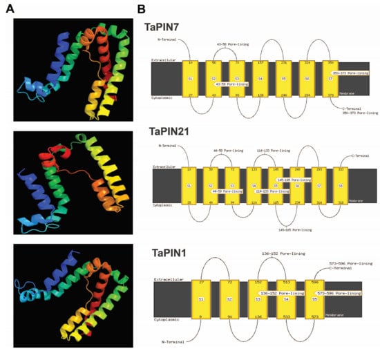 The protein characteristics, including the isoelectric point, lengths, and molecular weight of TaPIN proteins, were evaluated using the isoelectric point calculator [,] and ExPASy (https://web.expasy.org/compute_pi/ accessed on 12 May 2021). Subcellular localization was predicted using CELLO (http://cello.life.nctu.edu.tw/ accessed on 12 May 2021). The transmembrane helix and topology of the TaPINs were analyzed using SOSUI (http://www.cbs.dtu.dk, http://harrier.nagahama-i-bio.ac.jp accessed on 12 May 2021), TMHMM (http://www.cbs.dtu.dk/services/TMHMM/ accessed on 12 May 2021), and MEMSAT-SVM available in the Phyre2 server. The three-dimensional (3D) structure of TaPINs was produced using the Phyre2 server (http://www.sbg.bio.ic.ac.uk/phyre2/html/page.cgi?id=index).