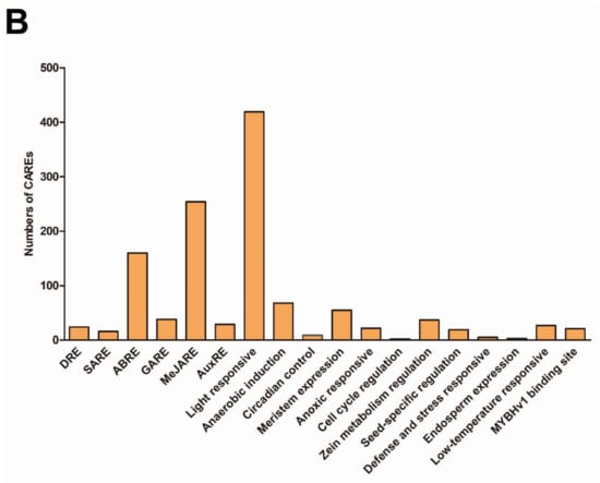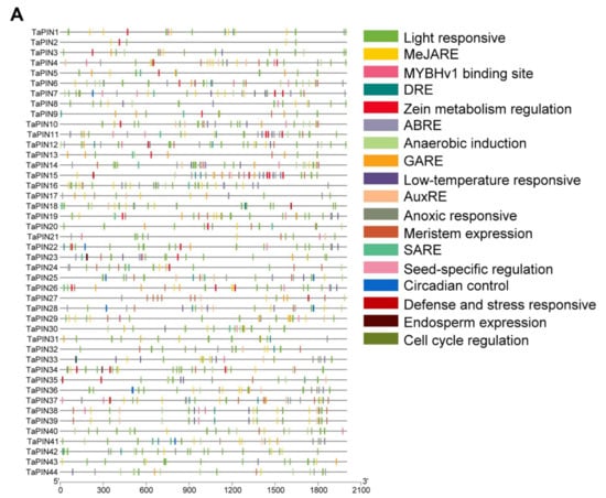 Putative cis-acting regulatory elements (CAREs) of the TaPIN gene family. The CAREs analysis was performed with the 2 kb upstream region using the PlantCARE online server. (A) Hormone-responsive elements, stress-responsive elements, growth and development-related elements, light-responsive elements, and other elements with unknown functions are shown by different colors. (B) Most commonly occurring CAREs in TaPINs.