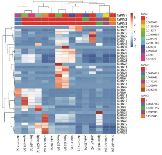 In addition, TaPIN31, TaPIN32, TaPIN35, TaPIN40 and TaPIN44 expression was raised at the grain z71 stage. TaPIN5, TaPIN9, TaPIN13, TaPIN21 and TaPIN28 showed higher expression at stem z32 and z65 stages. These results demonstrate that different TaPINs might participate in the development of different tissues at different stages.
