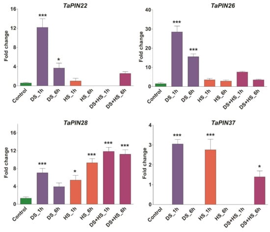 Quantitative real-time PCR analysis of selected TaPIN genes in response to drought and heat stress to verify RNA seq data. The wheat actin gene was used as the internal control to standardize the RNA samples for each reaction. Asterisk indicates significant differences compared with control over bars representing results of Tukey HSD test at the <0.05 and <0.001 levels (* p < 0.05 and *** p < 0.001). Error bars show standard deviation. Data are mean ± SD (n = 3).