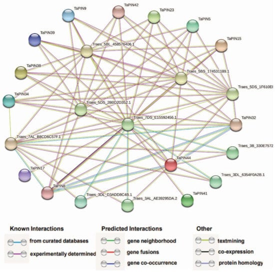 According to the predicted results, we identified thirteen TaPINs interacting with ten different T. aestivum proteins. TaPIN32 can interact with TaPIN8, TaPIN44, and six other T. aestivum proteins (Traes_5BL_458576406.1, Traes_5BS_174531189.1, Traes_5DS_1F610E80B.1, Traes_5DS_2B0D2D352.1, Traes_7DS_E15592456.1 and Traes_7AL_B8CD6C57F.1), which were ribosomal protein S6 kinase and protein kinase PINOID, a positive regulator of polar auxin transport through changes in the phosphorylation status of PIN proteins. Meanwhile, TaPIN44 can interact with TaPIN8 and nine other T. aestivum proteins (Traes_3AL_AE39295DA.2, Traes_3B_330E75723.1, Traes_3DL_6354F0A2B.1, Traes_3DL_D3ADD8C4B.1, Traes_5BL_458576406.1, Traes_5BS_174531189.1, Traes_5DS_1F610E80B.1, Traes_5DS_2B0D2D352.1 and Traes_7DS_E15592456.1), which were sorting nexin (SNX), ribosomal protein S6 kinase, protein kinase PINOID, and ABC transporter proteins. The sorting nexin (SNX) comprises a large group of proteins that are localized in the cytoplasm, which regulate intracellular trafficking through the lipid binding domain and protein–protein interactions with membrane-associated protein complexes. These results provided valuable information for the further functional characterization of TaPIN genes.