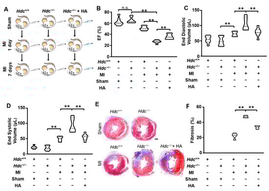 Hdc deletion reduced heart function at day 7 after MI. (A) Experimental design for transcriptomic analysis of Hdc+/+ and Hdc−/− mice, with or without histamine (HA, 4 mg/kg) treatment, at 0, 1, or 7 days post myocardial infarction surgery. n = 3 per time point. (B–D) Quantitative analysis of left ventricle ejection fraction (E,F), end diastolic volume and end systolic volume of mice at the 7th day post MI surgery. n = 5. (E) Representative figures of Masson’s trichrome staining of cardiac mid-sections from Hdc+/+ and Hdc−/− mice, with or without histamine. The myocardial fibers and collagen are colored blue. Quantitative analysis of the percentages of fibrosis is shown on the right. ** p < 0.01, n.s., no significance.