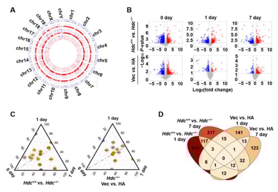 The gene expression profiling of the mice in each group. (A) Circos heatmap of differentially expressed genes. DEGs are present in the order of chromosomes. The bigger circles represent the DEGs at day 0, 1, and 7 after MI. The smaller circles compare the expressions of DEGs among Hdc+/+, Hdc−/−, and Hdc−/− with histamine treatment. (B) Volcano plots display DEGs with Hdc deficiency or histamine treatment at day 0, 1, and 7 after MI. Transcripts up-or down-regulated are in red or blue and those unchanged are in gray. (C) Venn diagram of DEGs overlapping at different experimental time points and under different treatments. (D) Triangle pictures show the expression of DEGs at day 0, 1, and 7 after MI, comparing Hdc+/+ vs. Hdc−/− (left), and Vec vs. HA (right).