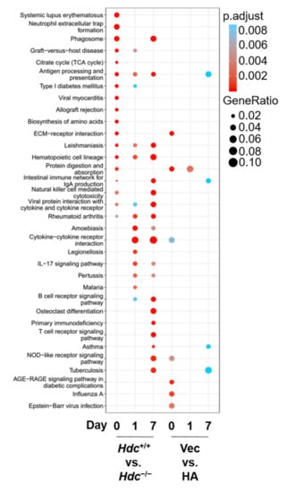 Kyoto Encyclopedia of Genes and Genomes (KEGG) analysis was then carried out to reveal enriched pathways altered across all time points [] (Figure 4). Immune-related pathways were significantly and specifically enriched in the Hdc−/− group versus the Hdc+/+ group at all the three time points, including antigen processing/presentation, Leishmaniasis, hematopoietic cell lineage, cytokine/cytokine receptor, and Rheumatoid arthritis. However, the pathways specifically enriched in the histamine-treated versus vehicle treated groups were less and scattered, and, apart from some immune-related pathways, NOD-receptor signaling and the protein digestion/absorption pathway were also enriched in these groups.