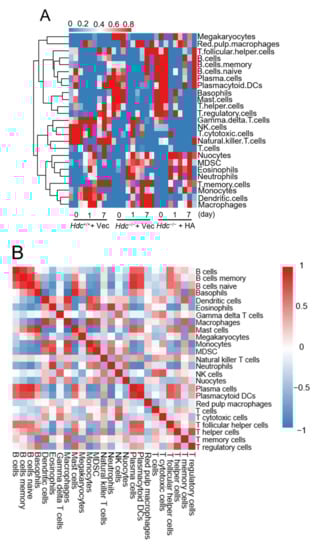 T follicular helper (Tfh) cells are antigen-presenting cells that are induced by CD4+ T cells and support B cell differentiation []. In our data, the infiltration scores of Tfh cells were up-regulated in the Hdc−/− groups and down-regulated in the histamine-treated groups. Moreover, B cell subsets had a similar infiltration pattern with Tfh cells, and the Tfh cell was strongly correlated with these B cell subsets. These imply that the aberrant infiltration of B cells in Hdc−/− groups may be driven by HDC−/− antigen-presenting-cells, DC cells, or macrophages.