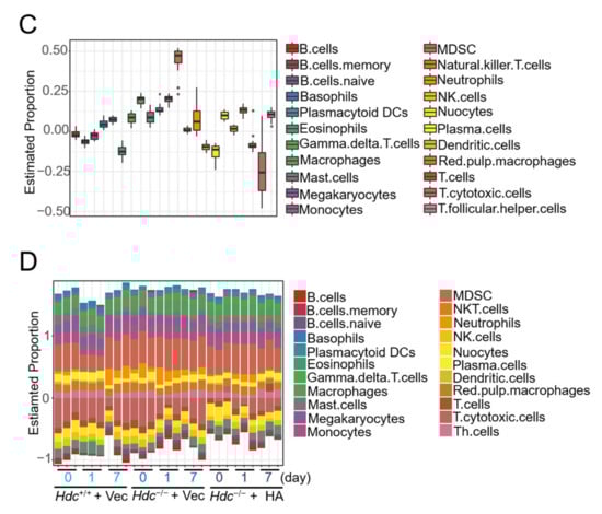 To evaluate the effects of Hdc/histamine on the composition of infiltrated immunocytes, we accessed the proportion of every immunocyte across the samples. We found that cytotoxic T cells were the most discrete among the 22 cell types. The cell ratio analysis indicated that cytotoxic T cells were decreased with Hdc deficiency but could not be reversed with histamine treatment (Figure 5C,D).