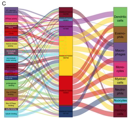ENSMUST00000181565 and ENSMUST00000180748 were highly correlated with macrophages, monocytes, and dendritic cells (coefficient > 0.79 and 0.74 respectively), potentially through regulating microtubule/tubulin/motor binding, ATPase/GTPase activity, and histone kinase activity. ENSMUST00000180693 was co-related with macrophages, monocytes, and T memory cells (coefficient > 0.68), potentially through affecting enzyme activator activity and nucleosomal DNA binding. ENSMUST00000191157 was highly co-related with macrophages, monocytes, and eosinophils (coefficient > 0.78), likely participating in cytokine/chemokine/receptor signaling, the Rac guanyl-nucleotide exchange factor/GTPase pathway, and phospholipase/phosphatidylinositol phosphate binding.
