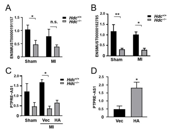 Finally, we used qPCR to validate the levels of the lncRNAs selected above (Figure 7A–C). The results showed that ENSMUST00000182785 was down-regulated in the Hdc−/− group versus the Hdc+/+ group both before and after MI surgery. However, the decreased range of the ENSMUST00000191157 level reached significance only in the sham groups, while the reduction of ENSMUST00000180693 (PTPRE-AS1) reached significance only in the MI groups. Histamine treatment partially elevated the PTPRE-AS1 level reduced by Hdc deficiency but did not reach a significant difference (Figure 7C).