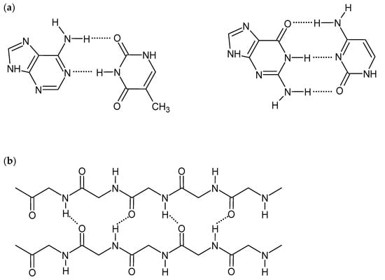 Hydrogen bonds are short-range interactions between hydrogen atoms of various groups, e.g., hydroxide (-OH), amine (-NH2), amide (-CONH-), and electronegative atoms having a lone electron pair (e.g., N, O, F). Although H-bonds are much weaker than covalent or ionic bonds, their collective nature promotes the self-assembling of the polymeric structures. They are critical for many biological and chemical systems and are also an important driving force to construct supramolecular hydrogels [1,8,9]. The strength of the hydrogen bonds is affected by the nature of constituent atoms, the bond geometry, and the environment. Therefore, the appropriate selection of gelators, consisting of a hydrogel, with various numbers and types of H-bond-forming groups, influences hydrogel mechanical properties and its interactions with biomolecules. The linearity of interactions, observed, for example, in DNA double-strand and protein β-sheet structures (Figure 1), gives stronger hydrogen bonds and also improves the gel strength [1,14]. Although H-bonds are stable in the presence of ions, pH changes may affect the intensity and strength of the bonds. The formation of competitive hydrogen bonds between gelator and water molecules may also cause deterioration of mechanical properties and even dissolving of the gel [8,9,11,14,15]. On the other hand, the ease of breaking and reformation of the hydrogen bonds gives the hydrogels self-healing and shear-thinning properties [1,16].