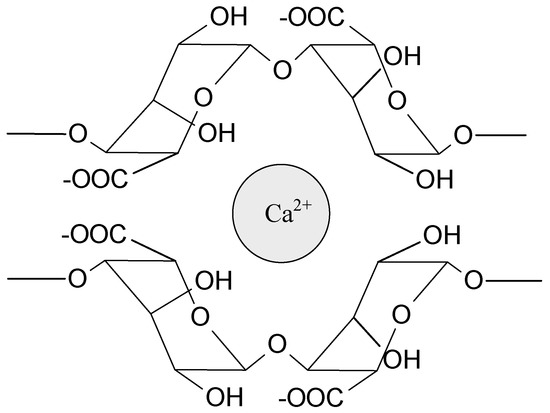 Sodium alginate (SA) is probably the most widely tested biopolymer cross-linked by interactions with ions. These polyanionic molecules can form hydrogels by an interaction with divalent (e.g., Ca2+, Sr2+, Ba2+) and trivalent metal cations (e.g., Fe3+, Al3+). Calcium ions are the most often used to prepare alginate-based hydrogels for medical applications (Figure 3). The source of Ca2+ (e.g., CaCl2, CaSO4, CaCO3) influences the gel strength and homogeneity. Interestingly, magnesium ions do not induce electrostatic interaction with alginates. Due to the high strength of the interactions, these hydrogels are relatively durable and stable, but they do not exhibit self-healing properties. Alginate can also electrostatically interact with polyelectrolytes such as chitosan [1,36,43,45]. Chitosan, as a positively charged polymer, willingly interacts with anionic molecules (phosphate salts, carboxylate salts) and creates polyelectrolyte complexes with polysaccharides (e.g., pectin, dextran, carboxymethyl cellulose, hyaluronic acid) and proteins (e.g., gelatin), as well as synthetic polymers, e.g., poly(acrylic acid) [36,43,46]. The ionically bonded hydrogels prepared from ampholytic polymers, e.g., proteins, poly(acrylamide), and poly(methacrylate) derivatives, have also been investigated [43,47,48,49]. The ionic interactions are present in many different systems and very often stabilize hydrogel structure, cooperating with other types of interactions.