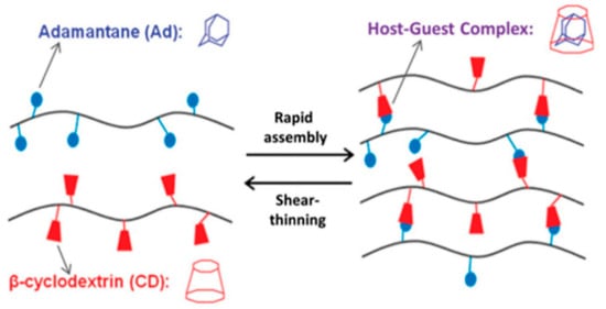 Another type of interaction used for the fabrication of supramolecular hydrogels is the host–guest interaction. The inclusion complex between the macrocyclic, containing a cavity, host molecule and the suitable guest molecule is formed. The clue of this interaction is the complementary size and shape of the host cavity and guest molecule. Both moieties may be engaged via non-covalent interactions, such as hydrogen bonds, Van der Waals, hydrophobic, electrostatic interactions, or coordination bonds. In this way, cavitands may be paired with various guests, including drugs, biomolecules, and polymers, which are both inert and stimuli-responsive. It is relatively easy to incorporate the host–guest moieties into the hydrogel structure, and the stoichiometry of this interaction is precisely defined (one host cavity can hold one guest molecule). This provides greater predictability and reproducibility of hydrogel properties. The reversibility of the host–guest interaction gives the hydrogels self-healing and shear-thinning properties [11,36,58,59,60].