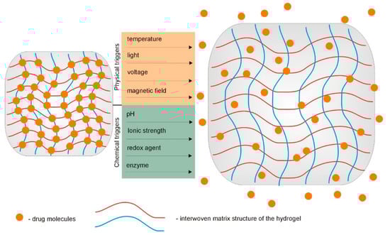 Hydrogels are a wide group of amazing materials that can increase in size due to their ability to absorb a large volume of water or other fluids, while maintaining integrity. Their mechanical and swelling properties may often change depending on environmental factors. These properties make hydrogels willingly used in various fields, e.g., food processing, agriculture, adhesives, personal care products, and, most of all, the biomedical field (from drug delivery systems and wound healing, to cell immobilization and tissue engineering [1,2]). The unique physical properties of hydrogels make them very useful as carriers of drugs and biologically active substances. High water content and flexibility make hydrogels similar to biological tissues. They are biocompatible and absorb proteins from body fluids to a minimal degree. Their porosity can be easily regulated by the cross-linking degree, and molecules of different sizes may be loaded into the hydrogel structure. The active substances released from hydrogel may also be modified by diffusion and swelling control, as well as by chemical processes, such as hydrolytic or enzymatic cleavage of the hydrogel network. A special advantage of the hydrogels are their ability to respond to various stimuli, such as pH or temperature changes, magnetic/electric field, light, and the presence of ions or other chemical molecules [3,4,5,6,7].