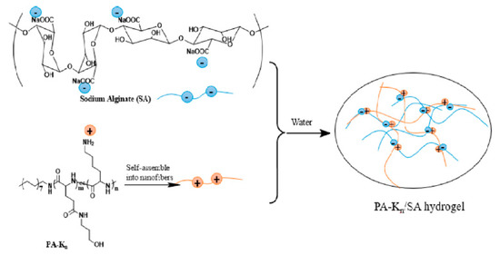 Many short peptides gelators that demonstrate antibacterial properties have the ability to self-assemble into the form of supramolecular hydrogels [1,122,126]. Moreover, peptide-based antibacterial hydrogels are characterized by good biocompatibility. It is also possible to modify their structure and other properties, especially antibacterial efficiency. Wan et al. obtained a series of cationic peptide amphiphiles (PA) that could self-assemble into hydrogels [127]. The obtained hydrogels contained lysine, which exhibits pH-responsive action and antibacterial activity, as well as sodium alginate (SA) as a gel strengthening agent (Figure 8).