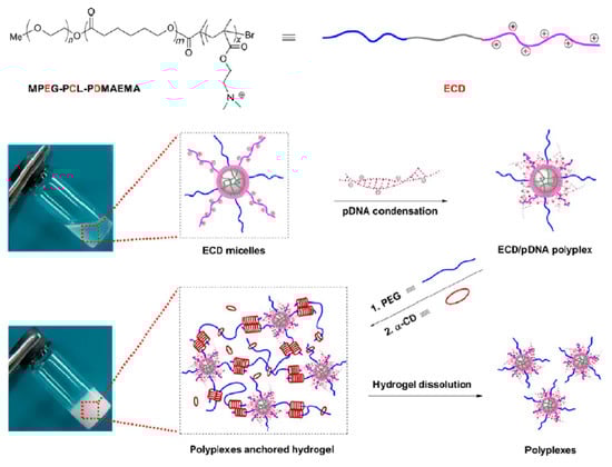 Schematic illustration for obtaining ECD/pDNA anchored α-CD/PEG supramolecular hydrogels (ECD corresponds to the MPEG-PCL-PDMAEMA, where E: MPEG, C: PCL, and D: PDMAEMA). Reprint with permission [142]; Copyright 2012, American Chemical Society.