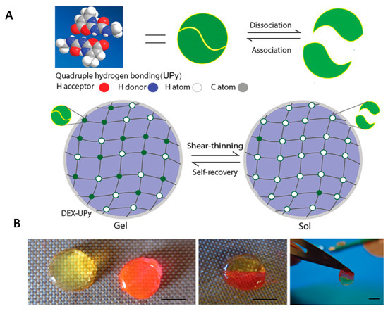 (A) Scheme of the experimental strategy for obtaining a DEX-UPy hydrogel with shear-thinning and self-integration properties; (B) visualization of these properties (scale bar corresponds to 5 mm). Reprint with permission [152]; Copyright 2015, Wiley.