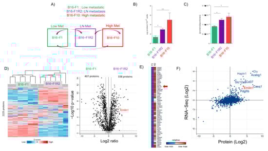 Defining the proteomic signature of sEVs secreted from lymph node metastatic melanoma models. (A) Schematic representation of the mouse melanoma models used. (B) Analysis of sEV number secretion and (C) total protein secreted in sEVs in mouse melanoma cells lines derived from low metastatic model (green), lymph node metastasis (purple) and distal metastasis (dark purple and red). n = 5. * p < 0.05, ** p < 0.01 using Mann Whitney test. (D) Unsupervised hierarchical clustering. 2225 proteins were identified in sEVs derived from B16-F1 and B16-F1R2 cell lines. To the right, a volcano plot showing the differentially expressed proteins (Student’s t-test, p < 0.05). Black circles represent proteins above the fold change cutoff. (E) Heatmap of genes differentially expressed in B16-F1R2 compared to B16-F1. As noted by the arrow, EMILIN-1 is over-expressed in both cell lines. (F) Correlation of proteomic and transcriptomic data to define the main genes overexpressed and proteins hyper-secreted in sEVs from B16-F1R2 compared to B16-F1 cell line.