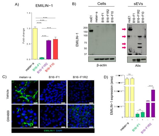During the last years, several studies have demonstrated that EVs play an important role in cell-cell communication being actively involved in tumor progression and metastasis []. Data support that tumor-derived EVs are key players in the formation of pre-metastatic niche formation at distal sites and metastatic organotropism []. Consistent with this, tumor-derived sEV can reach the sentinel lymph nodes favoring metastatic spread [,]. Indeed, they have been proposed to play a role in lymph node pre-metastatic niche formation []. It has been previously reported that metastatic melanoma models secrete higher amounts of proteins in sEV as compared to low metastatic models []. In addition, sEV protein concentrations are higher in the plasma and seroma of melanoma subjects with higher stages (III, IV) compared to lower stages (I, II) and subjects without cancer [,]. In agreement with that, we observed that sEVs from lymph node metastatic (B16-F1R2) and high metastatic models (B16-F10) secrete higher amounts of protein in sEV than poorly metastatic cell line B16-F1. However, the gene expression signatures associated to melanoma lymph node metastatic cells on sEV have never been defined. Therefore, in this work we have characterized the gene expression profile and the proteomic signature associated with sEV in the lymph node metastatic model B16-F1R2 []. Analysis of the mRNAs over-expressed in the cells and proteins hyper-secreted in sEV showed a signature related to ECM and processes linked to tumor-microenvironment interaction. Among all the proteins observed in the signature, we focused our analysis on EMILIN-1 due to its relevance in processes such as ECM remodeling, cell adhesion, lymphatic vessel functionality, and proliferation [,,,,].