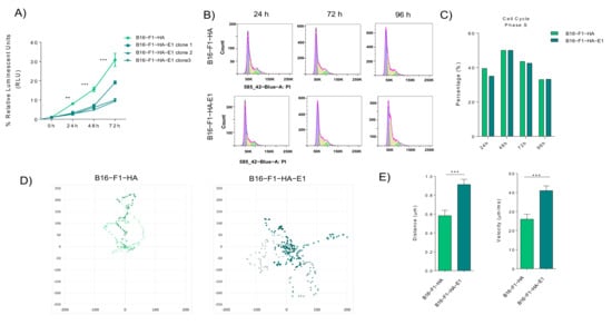 Cell cycle histograms for bulk DNA staining (PI), after addition of EdU, from B16-F1-HA and B16-F1-HA-E1 model were performed at 24, 48, 72, 96 h, and one week following manufacture protocol (Invitrogen #C10337). The percentage of B16-F1-HA and B6-F1-HAE1 cells in the S phase was calculated. The modified thymidine analog EdU was added 30 min before cell fixation. Cells were fixed by adding 100 μL PFA 4% (in PBS, freshly prepared) and Streptavidin-AF647 (Vector) was used after the EdU detection mix step. Data were acquired on BD FACS Canto II, at least 5000 single alive events were acquired and all data was analyzed using FlowJo® software v10 (BD, Ashland, OR, USA).