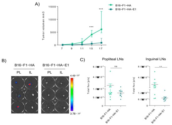 Overexpression of EMILIN-1 reduce tumor growth and lymph node metastasis. (A) Growth of subcutaneous xenografts established from B16-F1 and B16-F1-HA E1 cells (n = 5 per group) *** p < 0.001 by 2-way ANOVA. (B) in vivo imaging of popliteal and inguinal lateral LNs, from intrafootpad injected mice from B16-F1-HA andB16-F1-HA-E1 cells. (C) Total flux (p/s, photons per second) quantification of popliteal and inguinal LN, n = 10 ** p < 0.05 by Nonparametric t-test.