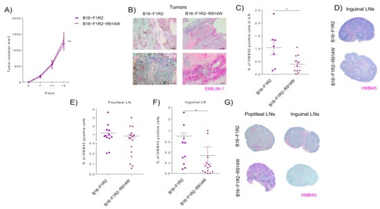 Analysis of EMILIN-1 stabilization mutant in vivo. (A) Tumor growth and lymph node metastasis of B16-F1R2 and B16-F1R2-R914W xenografts. C57BL/6 mice were injected subcutaneously with 1 × 106 B16-F1R2 (n = 8 mice) and B16-F1R2-R914W (n = 10 mice) cells. (B) Representative images of B16-F1R2 and B16-F1R2-R914W tumor sections stained for EMILIN-1. Bar: 100µm (C) Percentage of melanoma HMB45 positive cells quantification from inguinal lymph nodes were used for analyzed lymph node metastasis (B16-F1R2, n = 7 and B16-F1R2-R914W, n = 13) * p < 0.05 by Non-parametric t-test. (D) Representative images of inguinal lymph nodes (HMB45 staining) from B16-F1R2 and B16-F1R2 R914W xenografts. Bar: 500 µm. (E–G) Analysis of lymph nodes from C57BL/6 mice injected intrafootpad with 200,000 B16-F1R2 and B16-F1R2-R914W cells. Percentage of melanoma HMB45 positive cells quantification from (E) popliteal (B16-F1R2 group n = 12 and B16-F1R2-R914W group n = 16) and (F) inguinal lymph nodes (B16-F1R2 group n = 10 and B16-F1R2-R914W group n = 14), * p < 0,05 by Non-parametric t-test. (G) Representative images of popliteal and inguinal lymph nodes (HMB45 staining) from C57BL/6 mice. Bar: 500 µm.