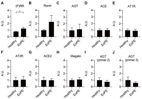 Gene expression levels of RAS components (A–G) and megalin (H) in healthy and early-onset pre-eclamptic (EoPE) placental tissue. (I,J): AGT expression was confirmed with different pairs of primers. Data are mean ± SEM of n = 12. * p < 0.05. (P)RR, (pro)renin receptor; AGT, angiotensinogen; ACE, angiotensin-converting enzyme; AT1R, angiotensin II type 1 receptor; AT2R, angiotensin II type 2 receptor; A.U., arbitrary unit.