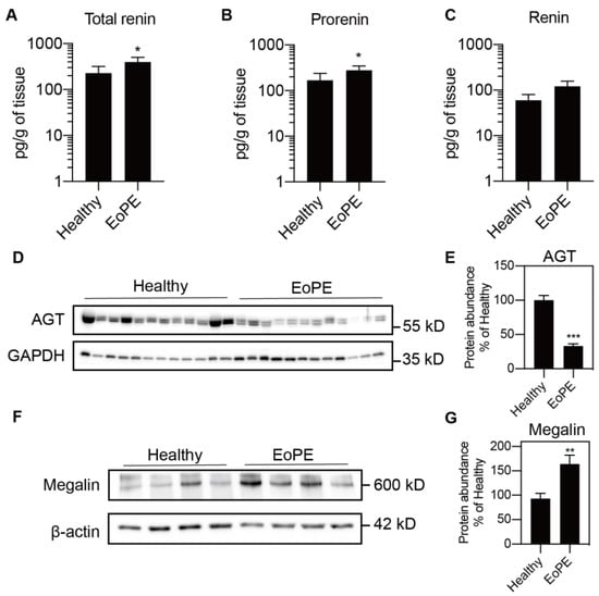 Total renin (A), renin (B) and prorenin (C) levels (n = 16) measured by immunoradiometric assay and angiotensinogen (AGT; D,E) and megalin (F,G) protein abundance (n = 12) measured by Western blot in healthy and early-onset pre-eclamptic (EoPE) placental tissue. Panels (D,F) are representative blots of AGT and megalin protein. Data were normalized versus GAPDH (E) or β-actin (G). Data are mean ± SEM. * p < 0.05, ** p < 0.005, *** p < 0.0005 vs. Healthy. AGT, angiotensinogen.