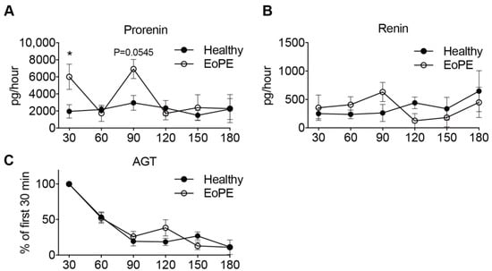 Prorenin (A), renin (B) and angiotensinogen (C) release from isolated perfused healthy (n = 5) and early-onset pre-eclamptic (EoPE, n = 6) cotyledons. AGT: angiotensinogen. Perfusate collection from two of the pre-eclamptic placentas could not be continued over the full 180 min due to fetal-to-maternal leakage. In such cases, only the samples prior to the occurrence of leakage were used. Data are mean ± SEM. * p < 0.05.