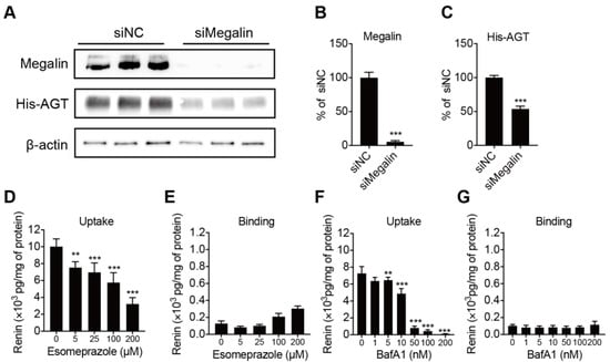 Panels (A–C): representative blots of His-AGT protein abundance in BN16 cells treated with negative control (siNC) or siRNA against megalin (siMegalin). Panels, (D–G): cell-associated renin levels after incubating BN16 cells with 100 U/L renin at 37 °C (D,F) or 4 °C (E,G) for 2 h in the presence of increasing concentrations of esomeprazole (D,E) or bafilomycin A1 (F,G). Data are mean ± SEM of n = 5–9. ** p < 0.005, *** p < 0.0005 vs. control.