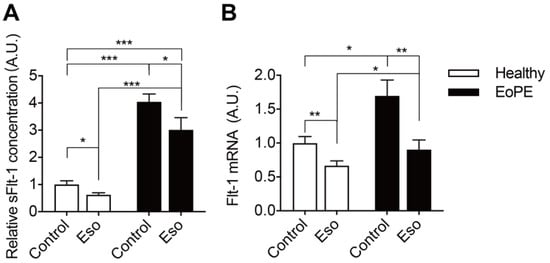 sFlt-1 levels in medium (A) and mRNA levels in explants (B) after incubating healthy or pre-eclamptic (EoPE) placental villous explants with 100 μM of esomeprazole (Eso) for 48 h. sFlt-1 level: healthy n = 18, EoPE n = 8; Flt-1 mRNA level: healthy n = 7, EoPE n = 4. * p < 0.05, ** p < 0.005, *** p < 0.0005 vs. 0. A.U., arbitrary unit.