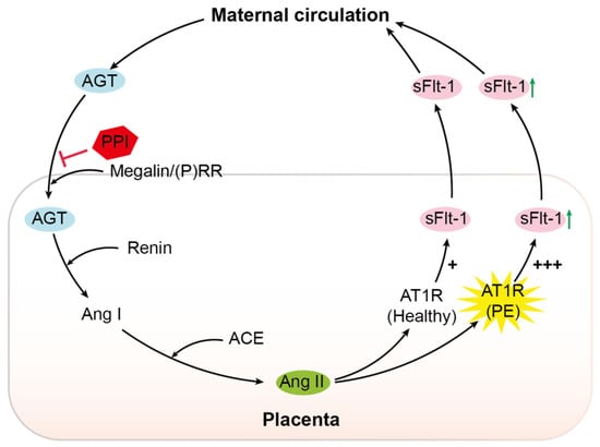 The (P)RR is an accessory protein of the V-ATPase. Its upregulation in pre-eclampsia, combined with increased megalin levels, favors increased activity of the megalin–V-ATPase pathway in this condition [,]. We recently reported that megalin is a novel endocytic receptor for (pro)renin in the kidney []. Inhibition of megalin and the (P)RR similarly suppressed endocytosis, without showing additive effects []. This confirms that megalin-mediated uptake relies on (P)RR/V-ATPase-dependent endosomal acidification. These data were obtained in BN16 cells, which predominantly express megalin, and no other renin/prorenin-binding receptors such as the mannose-6-phosphate receptor []. The latter receptor also occurs in trophoblast cells []. Using megalin-expressing BN16 cells, we were now able to show that the megalin–V-ATPase pathway also underlies AGT uptake. Moreover, we observed that the PPI esomeprazole, such as the V-ATPase inhibitor bafilomycin A1, inhibits megalin-mediated internalization. Given that megalin-mediated AGT uptake underlies renal angiotensin generation [], we speculate that a similar phenomenon may occur in the placenta. Here, we emphasize that the greater sensitivity of pre-eclamptic women to Ang II [,] may imply that placental Ang II levels do not necessarily have to be higher than those in healthy placentas in order to exert the same or even a stronger effect. Onda et al. showed that PPIs lower sFlt-1 synthesis in placental explants (confirmed in the present study), but were unable to link this to a direct consequence of V-ATPase inhibition with bafilomycin A1 []. Our data now reveal a new option: PPIs might suppress placental RAS activity by interfering either with AGT uptake, with (pro)renin transport, or both. Since lower placental Ang II levels are expected to result in diminished sFlt-1 production, this concept offers a novel explanation for the observation that PPIs lower circulating sFlt-1 in pre-eclamptic women (Figure 6).