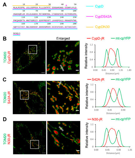 CypD derived fusion constructs exhibit mitochondrial localization. (A) Schematic drawing of the three peptide sequences inserted upstream of the genetically encoded Ca2+ indicator jRCaMP1b. (B–D) CypD-jRCaMP1b (shortened as CypD-jR), CypDS42A-jRCaMP1b (shortened as S42A-jR) and CypDN30-jRCaMP1b (shortened as N30-jR) all exhibited predominant localization inside the mitochondria of C2C12 cells. Immunostaining of TOM20 (green) highlights the outer mitochondrial membrane. Boxes highlight enlarged area. Grey strips in the enlarged image highlight areas for relative intensity (F − Fmin)/(Fmax − Fmin) profiling on the right. Scale bars: 5 µm, 1 µm.