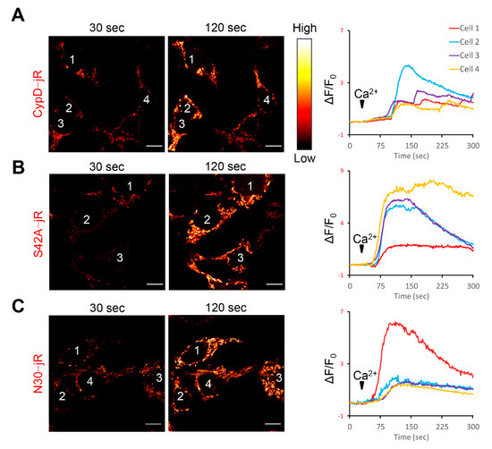 We generated three fusion constructs by combining mouse CypD derived peptides with jRCaMP1b. These peptides included full length mouse CypD (without stop codon), a phospho-resistant mutation at serine 42 (S42A) [33], and the mitochondria targeting sequence of CypD (coding sequence of the 30 amino acids at the N-terminus, as a negative control) [44] (Figure 1A). All three constructs were predominantly localized in the mitochondria after transfecting mammalian cell lines (Figure 1B–D). The representative images and kymographic measurements were from transfected C2C12 cells due to their flat morphology (the mitochondrial network spreads out mainly in XY plane, facilitating kymographic measurement). Next, we examined whether the jRCaMP1b in the fusion constructs could still respond to Ca2+ level changes, because C2C12 cells poorly express ryanodine receptors. We transfected the four constructs into HEK-tet-RyR2 cells, a specialized cell line highly expressing RyR2 after tetracycline treatment. These HEK cells exhibit a store overload induced Ca2+ release (SOICR) upon elevation of extracellular Ca2+, resulting in Ca2+ influx into the mitochondria [46,47]. The jRCaMP1b intensity notably increased in response to external Ca2+ stimulation (0 mM to 2 mM) for all three fusion constructs (Figure 2 and Videos S1–S3), confirming that the fusion setup did not undermine the functionality of jRCaMP1b.