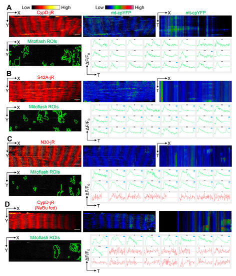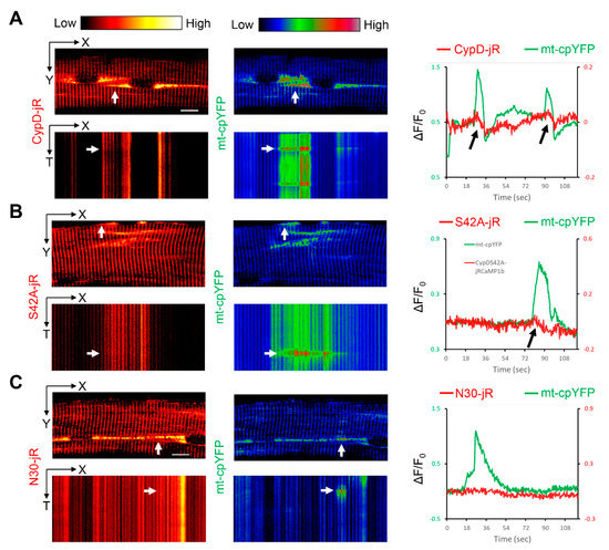 Next, we examined mitochondrial Ca2+ dynamics accompanying mitoflash events by co-electroporating the above jRCaMP1b based constructs together with mt-cpYFP into mouse FDB myofibers. For the three constructs tested, most mitoflash events in interfibrillar mitochondria were accompanied by no or subtle changes of [Ca2+]mito levels (a total of 91 interfibrillar regions analyzed in myofibers from 18 mice, see Figure S1A–C and Spreadsheet S1). This result may be supportive of the idea that mitoflash events are independent of CypD-mediated mPTP opening [2]. However, this can be due to the relatively low mitochondrial density at the interfibrillar region and the highly stringent [Ca2+]mito regulation in myofibers, causing interfibrillar [Ca2+]mito changes beyond the detection limitation of jRCaMP1b. Consistent with this idea, the application of pulsatory electric field stimulation only marginally increased the intensity of mitochondria-targeted jRCaMP1b, while the intensity of CaSiR-1 (representing cytosolic Ca2+ changes) increased tremendously (Figure S1D). The Ca2+ affinity of jRCaMP1b (Kd = 0.71 µM) and CaSiR-1 (Kd = 0.58 µM) are similar (n = 4) [28,48]. More importantly, in the perinuclear mitochondria, in which mitochondrial density is higher, we observed mitoflash events accompanied by drops of jRCaMP1b signals, especially in CypD-jRCaMP1b overexpressing myofibers (8 out of 31 perinuclear regions analyzed in myofibers from 5 mice, also see Spreadsheet S1, Figure 3A, and Video S4). One case was observed in CypDS42A-jRCaMP1b overexpressed myofibers (1 out of 19 perinuclear regions analyzed in myofibers from 4 mice, see Spreadsheet S1, Figure 3B, and Video S5). No such phenotype was observed in CypDN30-jRCaMP1b overexpressed myofibers (0 out of 23 perinuclear regions analyzed in myofibers from 7 mice, see Spreadsheet S1, Figure 3C, and Video S6). These observations indicate that under pathological conditions like CypD overexpression, at least part of the mitoflash events is indicative of an mPTP opening with transient mitochondrial Ca2+ efflux. We did not observe a mitoflash-associated decrease of jRCaMP1b signals in interfibrillar mitochondria of CypD-jRCaMP1b overexpressed myofibers, this may be due to lower mitochondrial density and the detection limitation of JRCaMP1b.