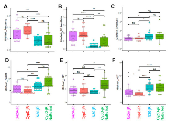 Through this analytical approach, we identified more frequent mitoflash events in CypD-jRCaMP1b overexpressed myofibers (18 myofibers from 5 mice) compared with CypDN30-jRCaMP1b overexpressed myofibers (18 myofibers from 4 mice, see Figure 4A, C, X-T view, Figure 5A, Videos S7 and S9, and Spreadsheet S2). The 2D area ratio was also significantly higher, implicating that mitoflash events occurred more broadly in the mitochondrial network (Figure 4A, C mitoflash ROIs, Figure 5B, Videos S7 and S9, and Spreadsheet S2). However, the averaged amplitude was slightly smaller (Figure 5C). The averaged FWHM and HDT were significantly shorter (Figure 4A, C X-T view, Figure 5D,F, Videos S7 and S9, and Spreadsheet S2), while the averaged HRT was comparable (Figure 5E and Spreadsheet S2). Mitoflash events in CypDS42A-jRCaMP1b overexpressed myofibers (18 fibers from 4 mice) exhibited similar properties to those in CypD-jRCaMP1b overexpressed myofibers and significantly differed from those in CypDN30-jRCaMP1b overexpressed myofibers (Figure 4B and Figure 5, Videos S8, and Spreadsheet S2). Although CypDS42A is a phospho-resistant mutation of CypD reported to decrease mPTP opening probability, the original study was conducted in a mouse embryonic fibroblast cell line depleted of endogenous CypD [33]. Thus, the similar mitoflash properties in CypD-jRCaMP1b and CypDS42A-jRCaMP1b overexpressed myofibers may be because the increased CypD level overwhelmed the impact of phosphorylation modification at serine 42. These observations support that the molecular mechanisms driving mitoflashes can be different at different CypD levels.