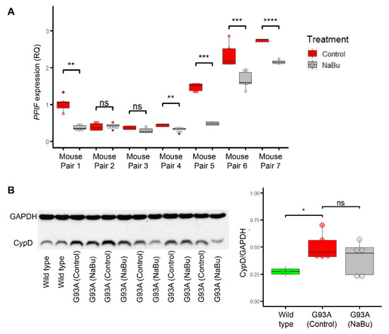 Our previous study showed butyrate feeding significantly alleviates the ALS disease progression of hSOD1G93A mice through improving gut integrity [45]. Since it is known that butyrate also acts as an HDAC inhibitor [53], here, we examined whether the butyrate treatment in the hSOD1G93A mice have an impact on CypD expression in skeletal muscle of the same ALS mouse model. Several pairs of gender-matched hSOD1G93A mice littermates were fed with or without 2% NaBu in drinking water starting at the age of ALS disease onset (3 months) for 4 weeks. Then, the tibialis anterior (TA) muscle samples were collected for qPCR to assess whether NaBu regulates CypD at transcription level (encoded by gene PPIF). In five out of these seven pairs, the NaBu fed littermates exhibited significant downregulation of PPIF (Figure 6A and Spreadsheet S3). For the other two pairs that did not show significant difference, the control littermate also had relatively low PPIF compared to other groups. Thus, NaBu exhibited a protective effect against ectopic upregulation of PPIF during the disease progression of hSOD1G93A mice. We also examined the CypD protein level (normalized to GAPDH) in TA muscles from five pairs of hSOD1G93A mice (littermates of the same batch) with or without NaBu feeding for 4 weeks from 3 months of age, as well as two wild-type mice (Figure 6B, Figure S2 and Spreadsheet S4). The butyrate fed mice exhibited a general trend of lower CypD protein level, although not statistically significant. This lack of significance may be attributable to several factors, not limited to gender differences, variations in the daily consumption rate of NaBu water, disease onset time, disease progression speed, etc.