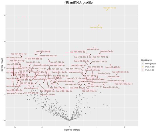 Differentially expressed miRNAs were used to predict mRNA targets in miRWalk (http://mirwalk.umm.uni-heidelberg.de/search_mirnas/; accessed on 18 October 2020) and miRDB (http://www.mirdb.org/; accessed on 18 October 2020) databases. miRDB target prediction was restricted to gene targets with prediction scores less than 60, and miRNAs with more than 2000 genes in the genome were excluded. For prediction in the miRWalk database, no restrictions were used. All genes expressed in our samples, which appeared in the predicted targets in either of the databases, were used for correlation analysis. Pearson correlation was used to correlate log10 transformed normalized expression values of differentially expressed miRNAs with log10 transformed normalized expression values of expressed genes. Only pairs with a correlation better than −0.7/0.7 were considered for further GO analysis and KEGG pathway. GO analysis and KEGG pathway were performed using clusterProfiler with the same parameters described in Section 4.6.