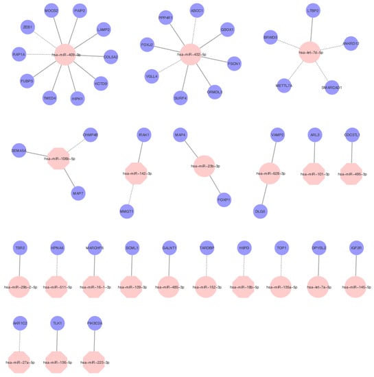MiRNAs regulatory network. Examples of flexible and selective regulatory networks between miRNAs and mRNAs in samples after LVAD support. Selected overexpressed miRNAs are highlighted in pink circles, and underexpressed miRNAs are highlighted in pink octagons. The targets are highlighted in blue circles. The full line indicates a positive correlation, and the discontinued line indicates a negative correlation with target mRNAs.