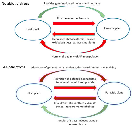 The influence of parasitic plants on their hosts is not limited to simple exhaustion of nutrients. It was reported that parasitic plants could also manipulate host metabolism to serve their own needs. For examples, the root hemiparasite Phtheirospermum japonicum was found to transfer cytokinins into the host to cause root hypertrophy [114]. Moreover, Cuscuta spp. can actively transfer microRNAs into theirs hosts, targeting mRNAs in order to improve nutrient uptake [115,116,117]. So far, it remains unknown whether the pattern of host manipulation is affected by abiotic stress factors. However, evidence was provided that Cuscuta spp. may be responsible for transfer of stress signals between simultaneously infected hosts, thus affecting positively response to salt stress [118], which was also previously shown for herbivore-induced signals [119].
