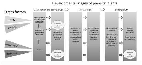 Parasitic plants may be affected by abiotic stress factors in a similar way as their hosts, e.g., by constraints of seed germination and seedling development due to drought and/or salinity, or indirectly, i.e., due to host-related constraints. The latter is especially true for holoparasites, most of which have no or only limited soil contact and lack photosynthesis. The possible effects of abiotic stress on host-parasitic plant interactions are summarized in Figure 1.